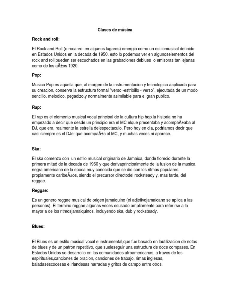【Tipos de Música】 ¿Cuántos 【Géneros Musicales】 hay ... Géneros musicales (tipos de música): Bachata Baladas Blues Bolero Bosa Nova Celta Clásica Corrido Country Criollo Cumbia Disco Djent Dubstep Electrónica Electro Pop Flamenco Folk Funk Garage Rock Gospel Grunge Hard Rock Heavy Metal Hip Hop House Indie Jazz K-Pop Merengue Perreo