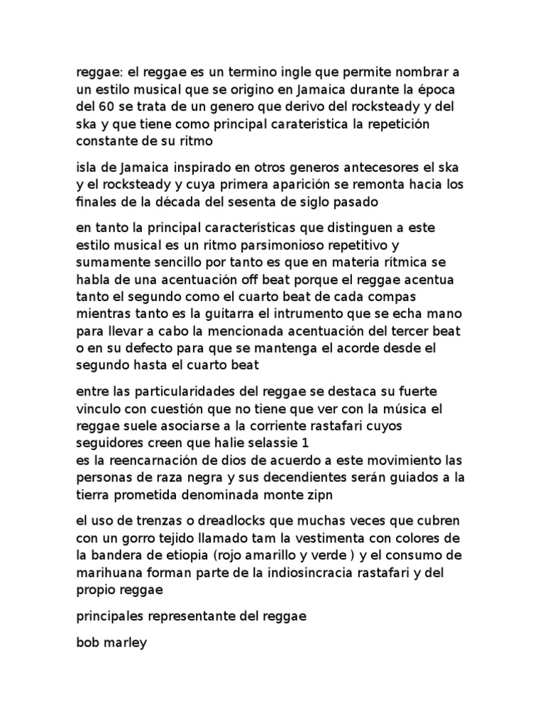 La Música Típica De Cada País | Criticalandia El reggae es la música típica de Jamaica. La cumbia es el más conocido de Colombia. La música electrónica es el género musical más conocido surgido en Alemania. La samba es el más famoso originado en Brasil. El pop, el punk y el metal son los géneros más famosos originados en Reino Unido. El tango es el más conocido de Argentina. Estilo musical afrocaribeño nacido en Jamaica | Música ... Las canciones de trovadores se cantan a solo y no en grupo. Las cantigas de santa María compsiciones poéticos-musicales en lengua galaico-portuguesa.Aunque de texto religioso, se considera muscia profana. el reggae es un estilo muscial afrocaribeño nacido en Jamaica. El principal representante de este estilo fue bob marley!