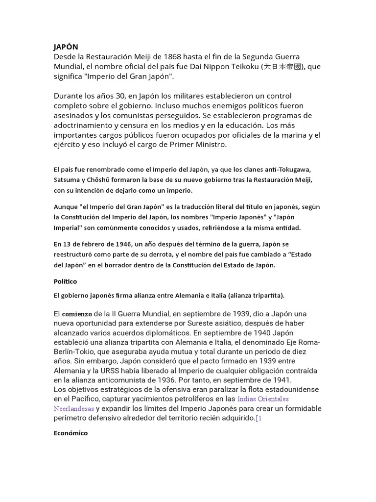 Nombre de tokio hasta 1868. ¿Por qué Tokio cambió su nombre? - dishonmarket.com La bahía tomó su nombre actual en los tiempos modernos, después de que la corte imperial se mudara a Edo y cambiara el nombre de la ciudad a Tokio en 1868. ¿Tokio y Japón son lo mismo? Tokio, anteriormente (hasta 1868) Edo, ciudad y capital de Tokio a (metrópolis) y de Japón. Japón - VisitaVirtual.info Desde el siglo XII hasta 1868 Japón estuvo gobernado por sucesivos shogunatos militares que ejercían el poder en nombre del emperador. En el siglo XVII el país entró en un largo periodo de aislamiento que no terminó hasta mediados del siglo XIX. Después de casi dos décadas de conflictos internos e insurrecciones se restauró al emperador ... Castillo Edo - Unionpedia, el mapa conceptual , a veces romanizado como Jedo, Yedo o Yeddo, es el nombre que tuvo Tokio hasta 1868, año de la restauración Meiji. ¡Nuevo!!: Castillo Edo y Edo · Ver más » Gran incendio de Meireki. El, también conocido como incendio Furisode, destruyó entre el 60 y 70 % de la capital japonesa de Edo (hoy Tokio) el 2 de marzo de 1657. ¡Nuevo!!: El período Meiji de Japón y su influencia en la cultura ... La era Meiji (明治時代) o Período Meiji se extendió desde el 23 de octubre de 1868 hasta el 30 de julio de 1912. El 3 de febrero de 1868, Mutsuhito sucedió a su padre, el Emperador Kōmei y fue proclamado emperador, comenzando una nueva Era llamada Meiji. La proclamación del nuevo emperador es lo que se conoció como Restauración Meiji ...