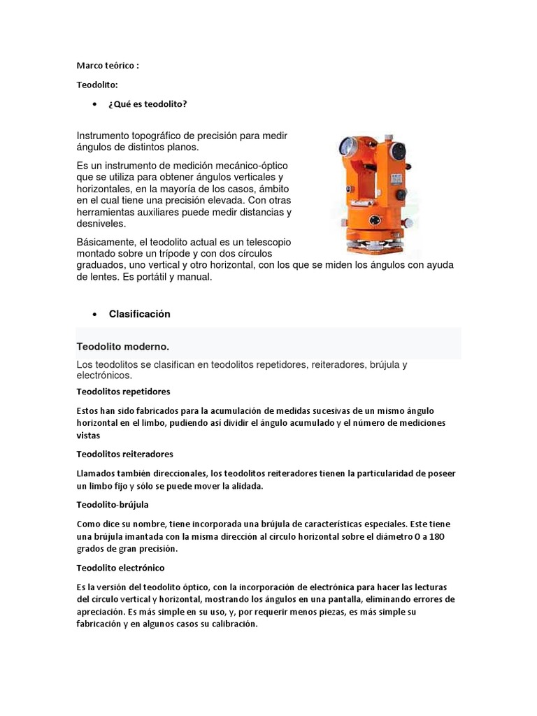 Monografia de (todos) los instrumentos topográficos Características y Funcionamiento: Instrumento topográfico para medir ángulos verticales y horizontales, con una precisión de 1 minuto (1´) o 20 segundos (20"), los círculos de metal se leen con lupa, los modelos viejos tienen cuatro tornillos para nivelación, actualmente se siguen fabricando, pero con solo tres tornillos nivelantes ...