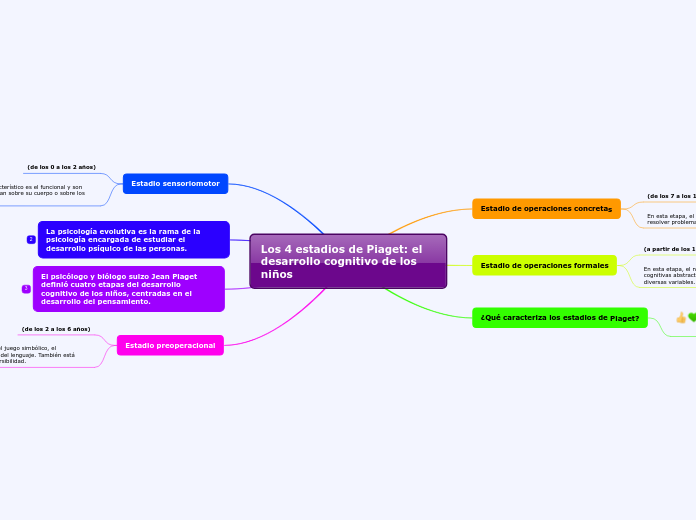Los estadios de Piaget: conoce las 4 etapas del desarrollo cognitivo... ¿En qué estadios de Piaget se divide el desarrollo cognitivo? Piaget divide el desarrollo cognitivo en cuatro etapas o períodos de tiempo, cada uno de ellos marcado por una serie de habilidades... Las 4 etapas de desarrollo de Piaget (teoría del...) - Significados Para Piaget, el desarrollo de la inteligencia comienza en la niñez y tiene cuatro estadios con edades y características definidas. Etapa sensorio motora (desde el nacimiento hasta los dos años). Estadios de Piaget Estadios de Jean Piaget. "Los estadios que Piaget propone registran las habilidades adquiridas tanto en el terreno de la lengua como en el del pensamiento y el del movimiento corporal"(Agudelo...