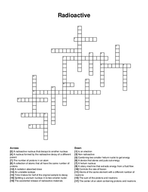 Radioactive Element Crossword Clue, Puzzle and Solver - Crossword Leak The Crosswordleak.com system found 25 answers for radioactive element crossword clue. Our system collect crossword clues from most populer crossword, cryptic puzzle, quick/small crossword that found in Daily Mail, Daily Telegraph, Daily Express, Daily Mirror, Herald-Sun, The Courier-Mail and others popular newspaper.